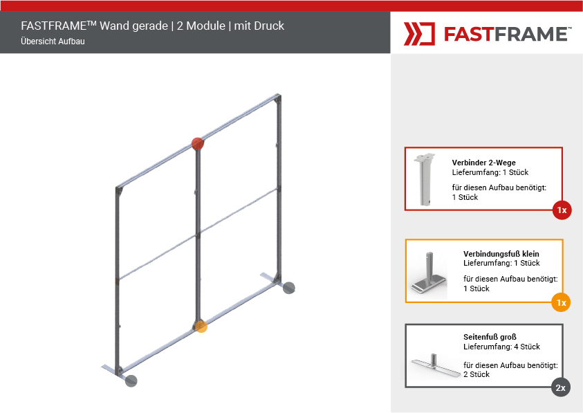 Der FASTFRAME™ gerade Wand mit 2 Modulen ist die ideale Lösung für professionelle Präsentationen, Messen und Events. Dank seines leichten, vormontierten Aluminiumrahmens mit 40 mm Profil lässt er sich in Sekundenschnelle aufstellen – ganz ohne Werkzeug. Eine zentrale Stützstange sorgt für zusätzliche Stabilität, während optionale Standfüße den Halt optimieren.